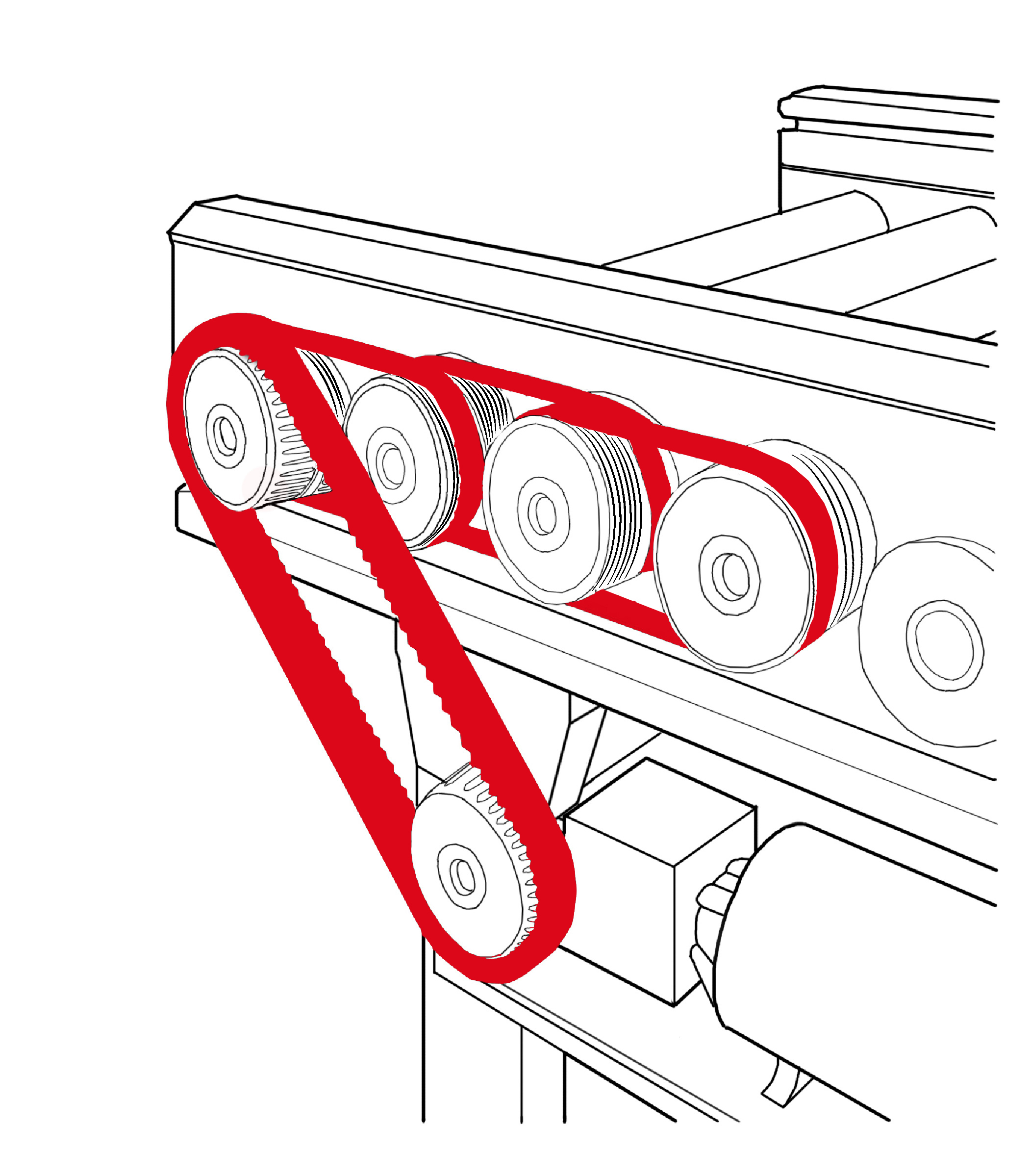 Timing belts or poly-v rib belts are commonly used on roller conveyors. On the external side of the roller, power transmission belts deliver power from the motor to the main driven conveyor roller. From this stage rollers are interconnected by either timing belts or poly-v rib belts, some of which can be produced with elastic-stretch properties.