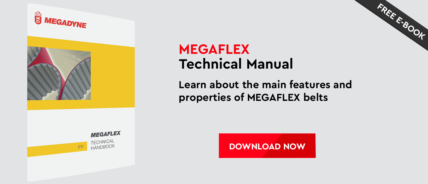 Megaflex timing belts are manufactured in thermoplastic polyurethane, with continuous spiral steel cords. this type of belt, developed by our research & development, offers good running characteristics and high traction loads.